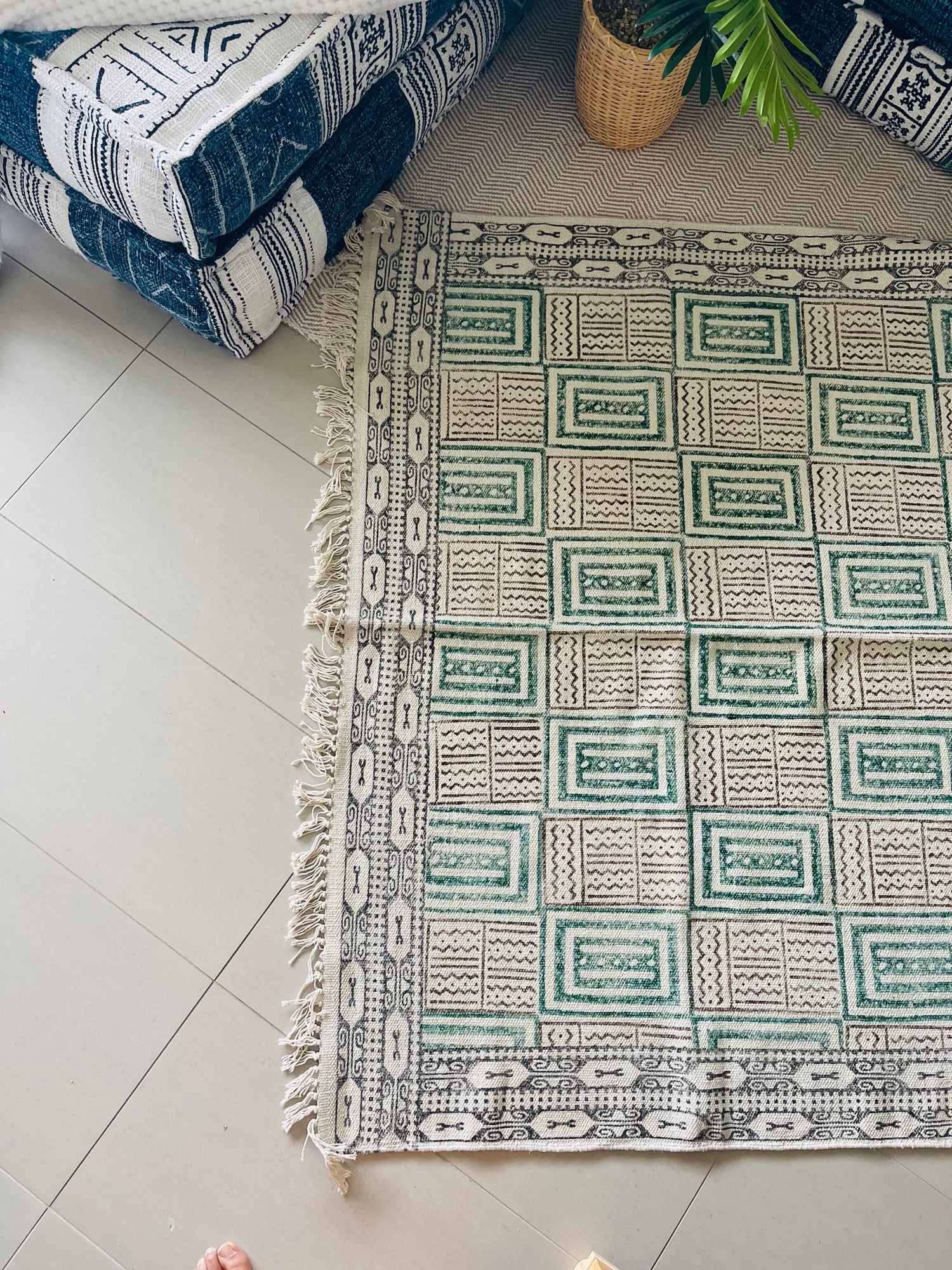 The intricate patterns adorning the rug are the result of careful hand-printing by local artisans, making each piece a unique expression of creativity and skill. Measuring 185cm x 125cm, this handcrafted rug is not just a functional addition but a statement of style that effortlessly enhances any living space.