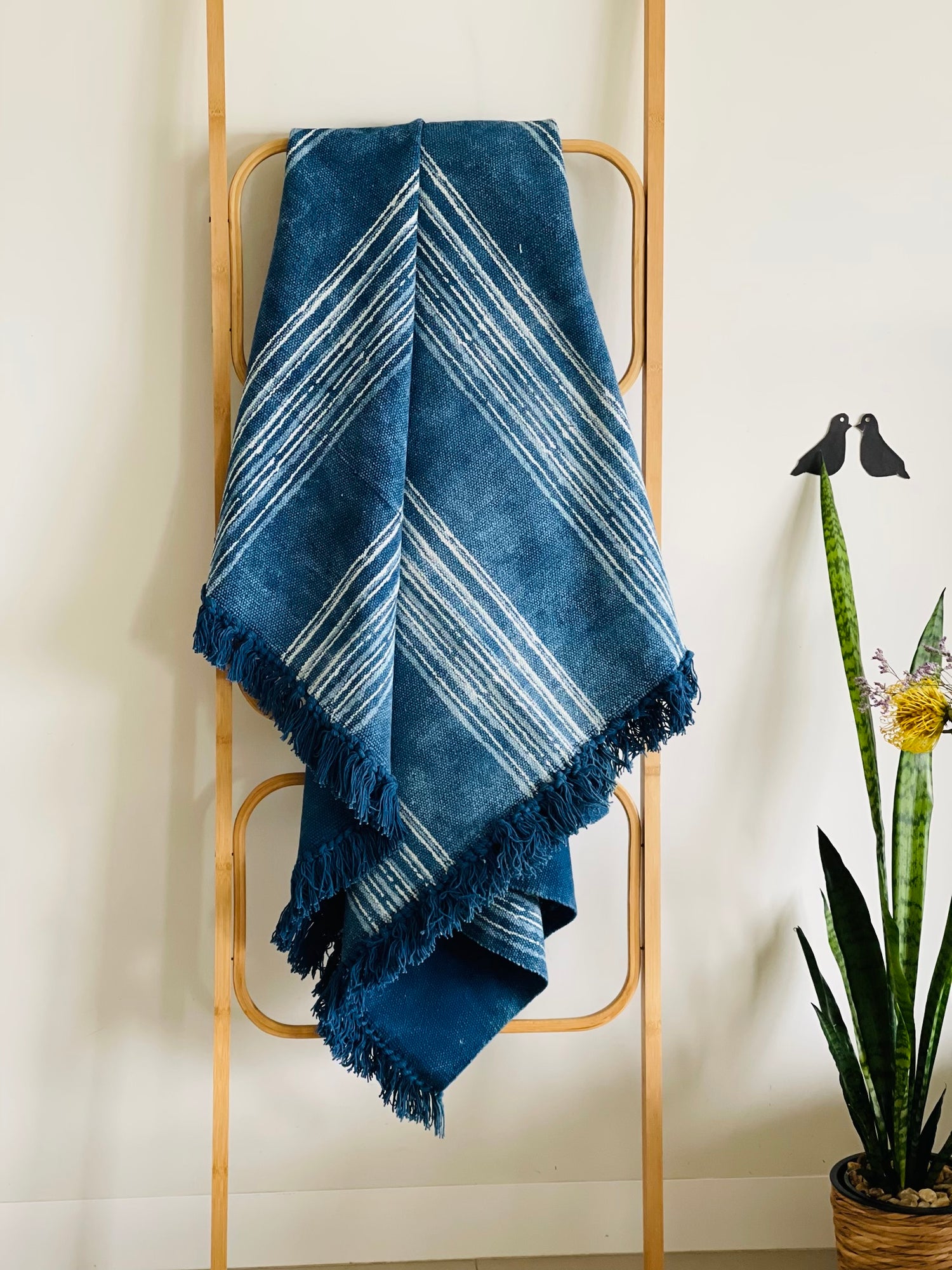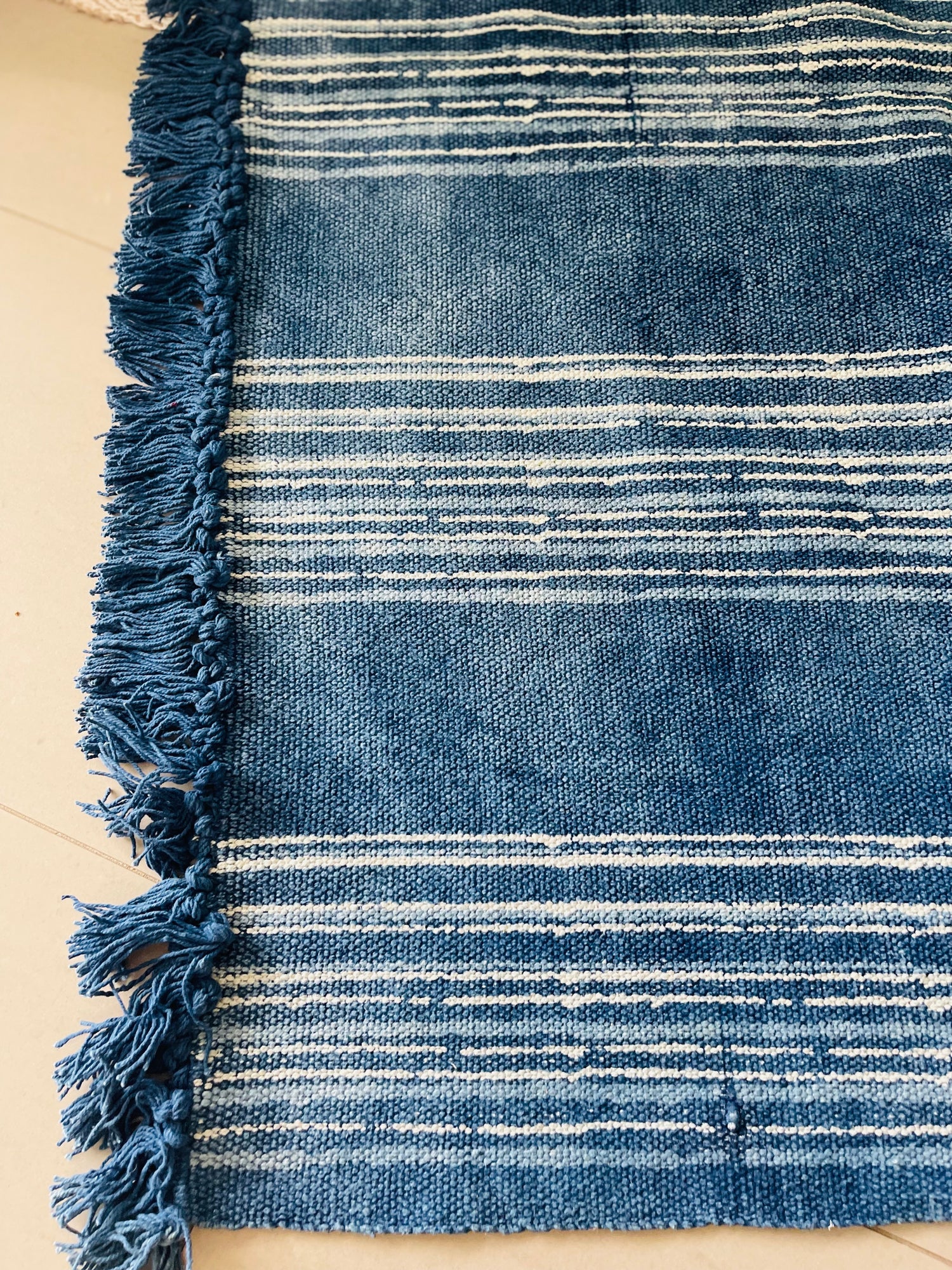 Elevate your home decor with the unique charm of our Indigo Multi-Stripe Throw Rug—a fusion of tradition, contemporary design, and the skilled hands of local artisans. Enrich your living spaces with a touch of cultural elegance and handmade authenticity.